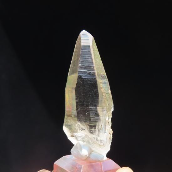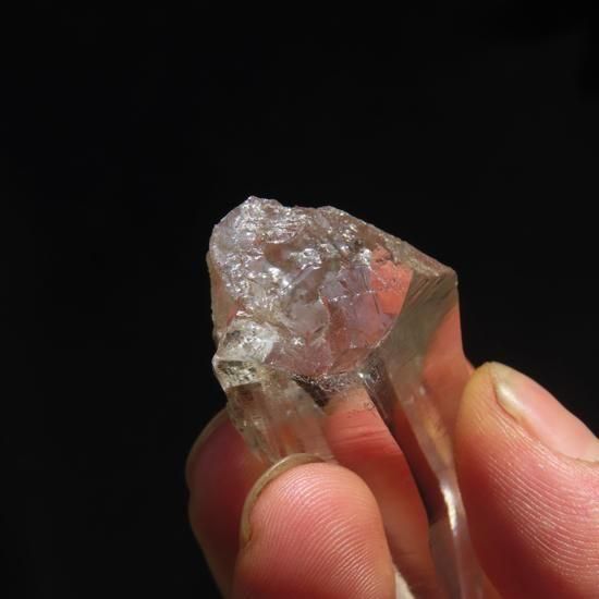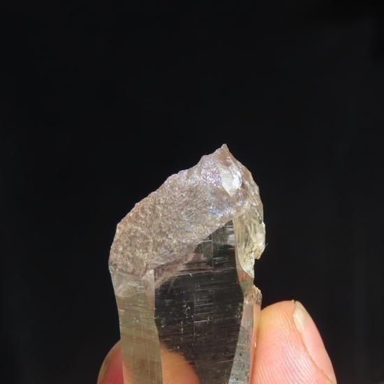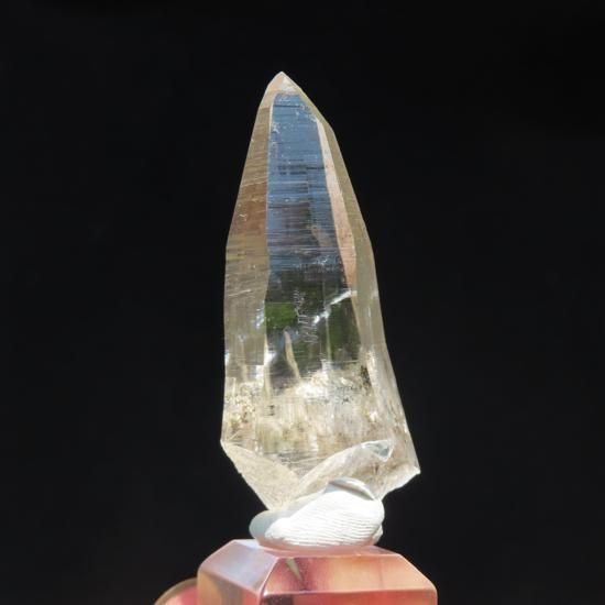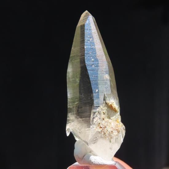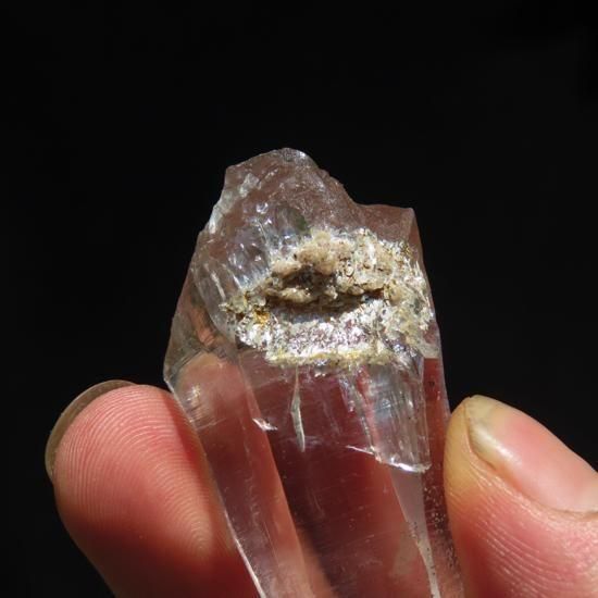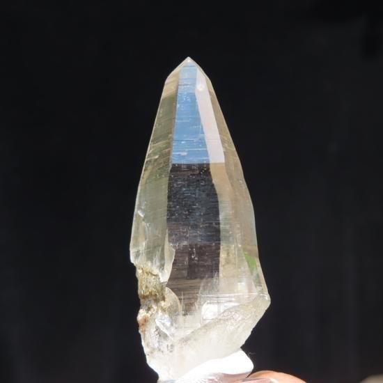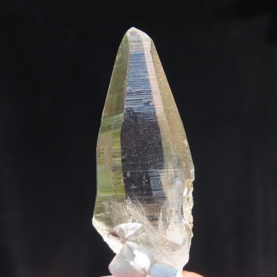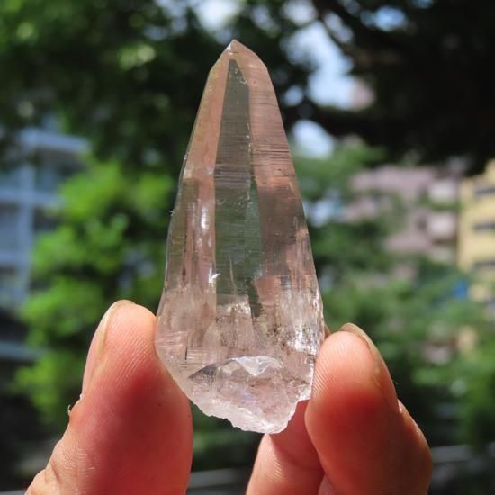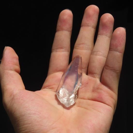 頭からつま先まで抜群な透明度を持った水晶原石です。先細りシェイプでバッチリセルフヒールドになっています。裏面には劈開性があるように見えるのでおそらくマイカが付着しています(画像6枚目参照)。手のひらに収まるサイズですが、ずっと見ていられるような結晶です。