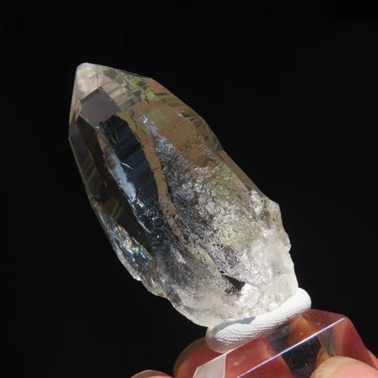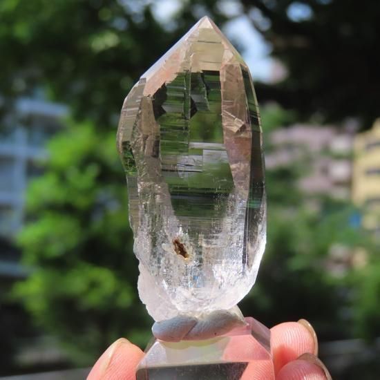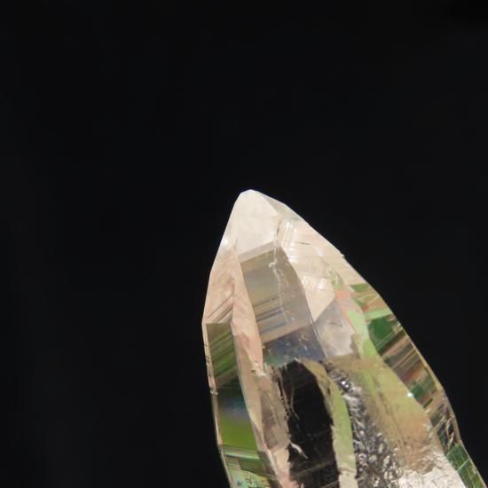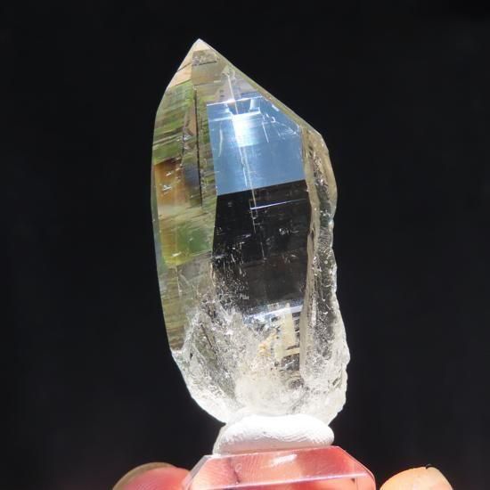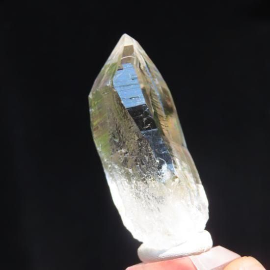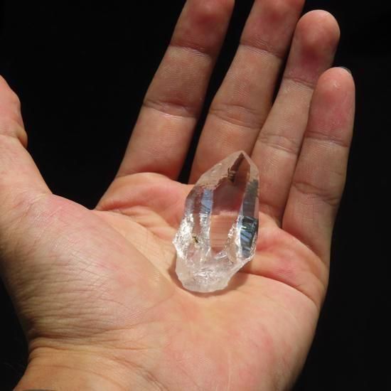 頭からつま先まで抜群な透明度を持った水晶原石です。先細りシェイプでバッチリセルフヒールドになっています。裏面には劈開性があるように見えるのでおそらくマイカが付着しています(画像6枚目参照)。手のひらに収まるサイズですが、ずっと見ていられるような結晶です。