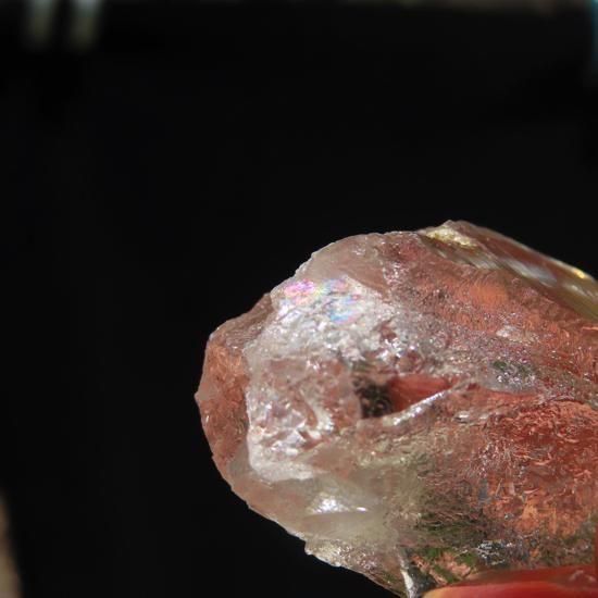 成長線、接合線も美しく、フォルムも整っています。 全ての面が光の角度によって虹色に光るゴールデンヒーラータイプになっています。 また、小さな水晶が3つポイント貫入、内包されており、クォーツインクォーツになっています。(写真5,6枚目参照)状態も良くずっと手に取って見ていたくなるような水晶です。