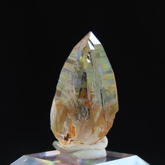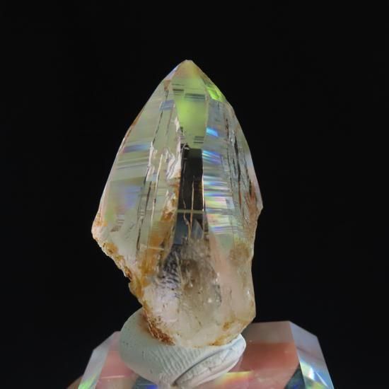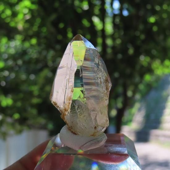 成長線、接合線も美しく、フォルムも整っています。 全ての面が光の角度によって虹色に光るゴールデンヒーラータイプになっています。 また、小さな水晶が3つポイント貫入、内包されており、クォーツインクォーツになっています。(写真5,6枚目参照)状態も良くずっと手に取って見ていたくなるような水晶です。