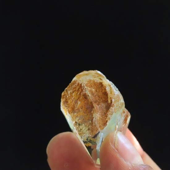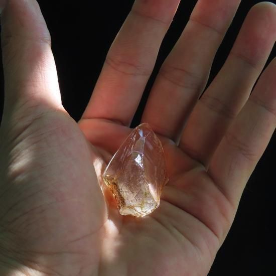 頭からつま先まで抜群な透明度を持った水晶原石です。先細りシェイプでバッチリセルフヒールドになっています。裏面には劈開性があるように見えるのでおそらくマイカが付着しています(画像6枚目参照)。手のひらに収まるサイズですが、ずっと見ていられるような結晶です。
