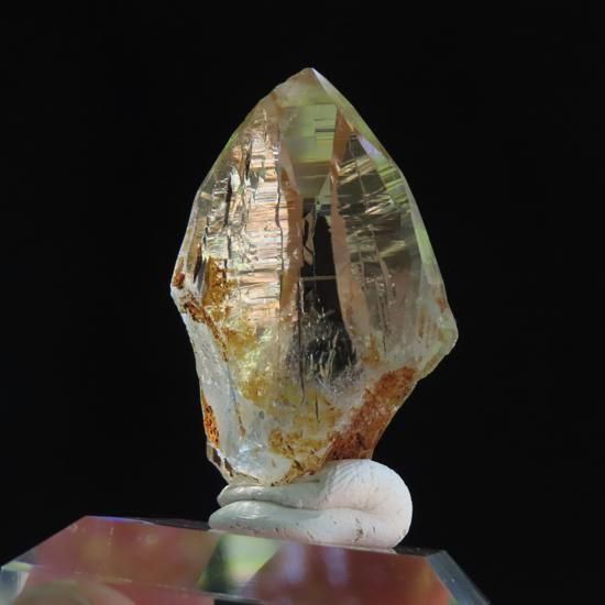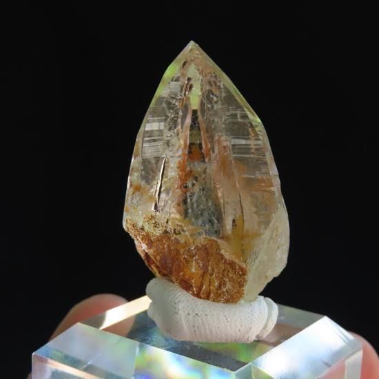底面にリモナイト(褐鉄鉱)が付着することにより結晶全体に暖色系の印象を与えます。