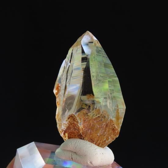 全体的に透明度が非常に高く透き通ったクリスタルです。ライトスモーキーな色味とリモナイトが引き締まった印象をもたらします。また内部にクラックがあるため角度により虹を見ることも出来ます。正面から見た時の透明度は極上です。さらに裏面には非常に細かく成長線と接合線が見られます。ガネーシュヒマールらしいシェイプを持った素晴らしいクリスタルです。