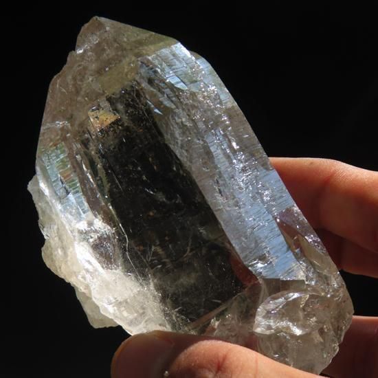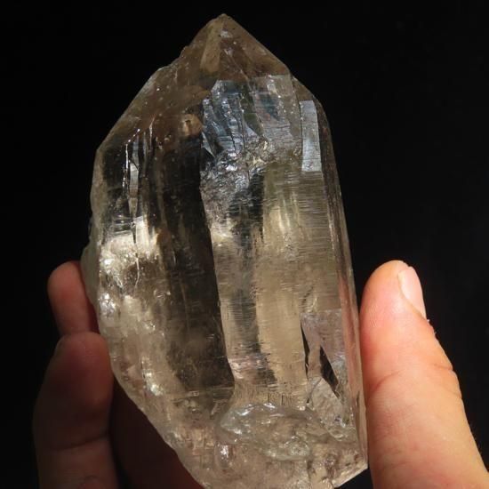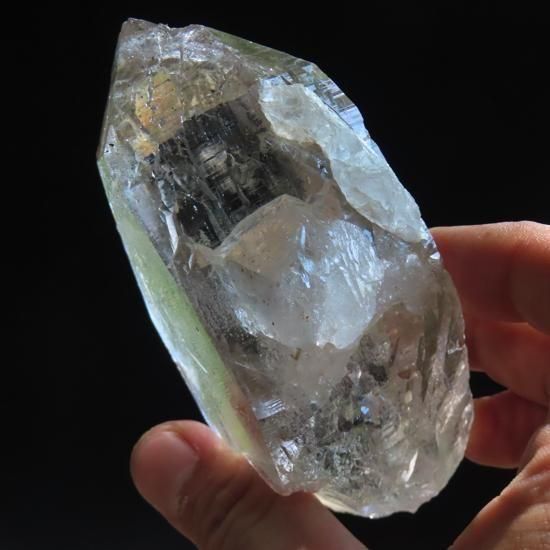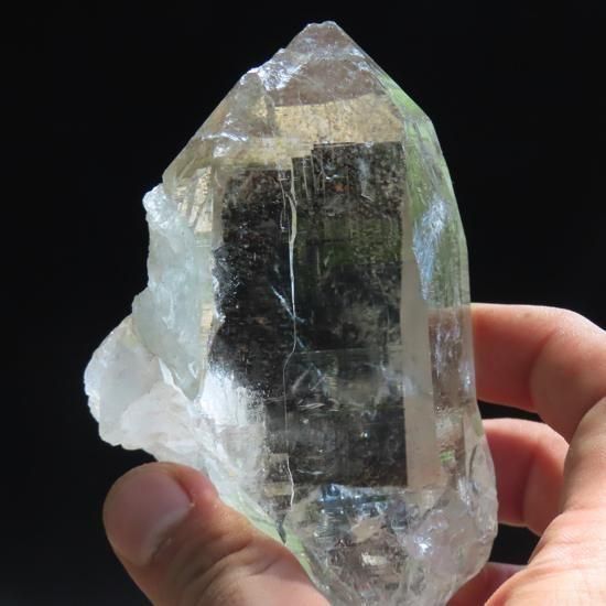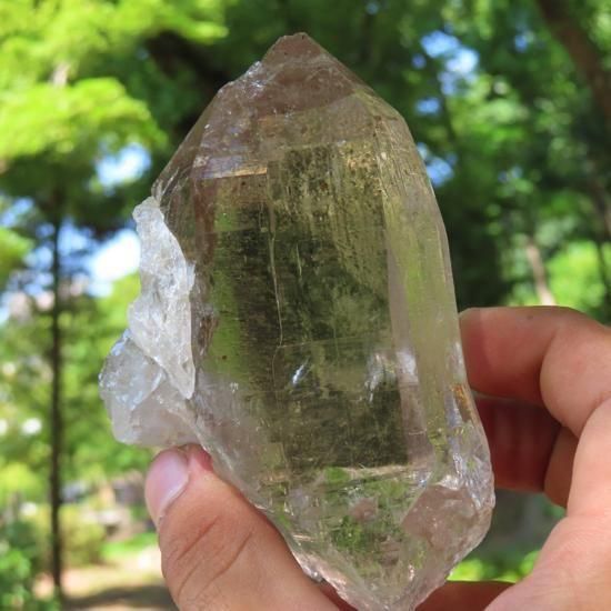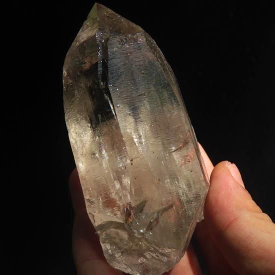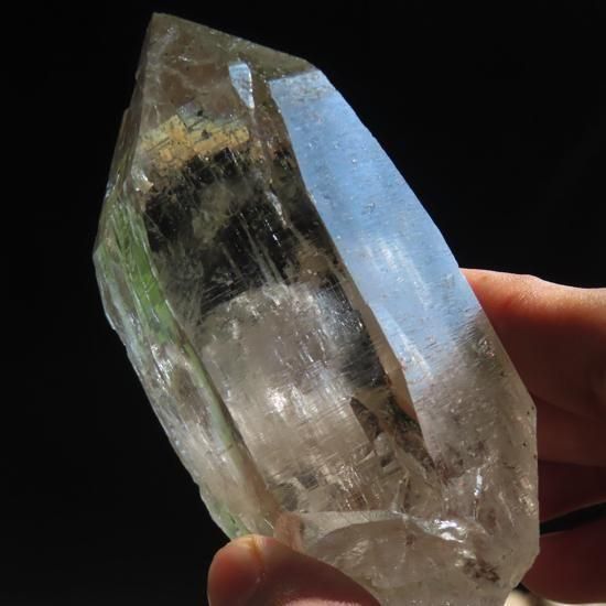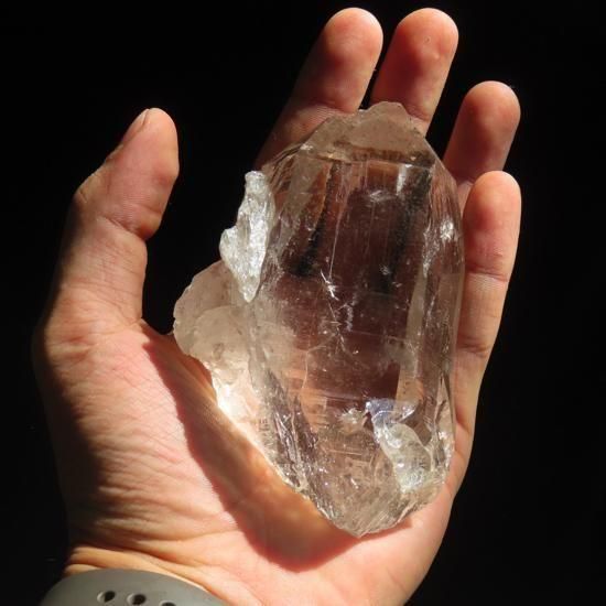 頭からつま先まで抜群な透明度を持った水晶原石です。先細りシェイプでバッチリセルフヒールドになっています。裏面には劈開性があるように見えるのでおそらくマイカが付着しています(画像6枚目参照)。手のひらに収まるサイズですが、ずっと見ていられるような結晶です。