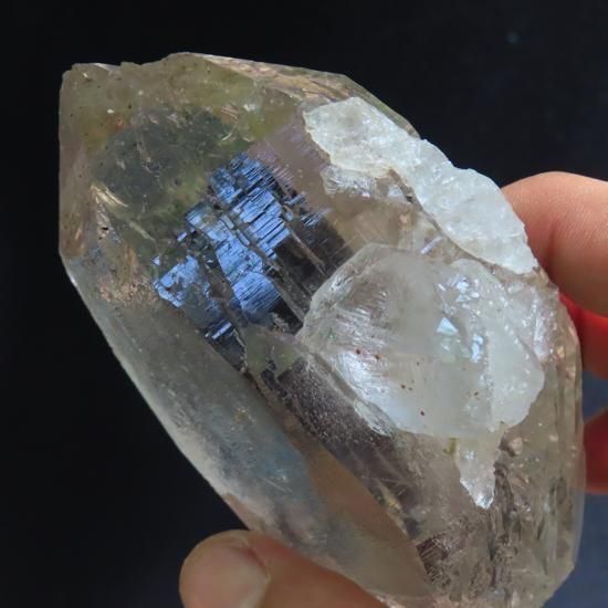 成長線、接合線も美しく、フォルムも整っています。 全ての面が光の角度によって虹色に光るゴールデンヒーラータイプになっています。 また、小さな水晶が3つポイント貫入、内包されており、クォーツインクォーツになっています。(写真5,6枚目参照)状態も良くずっと手に取って見ていたくなるような水晶です。