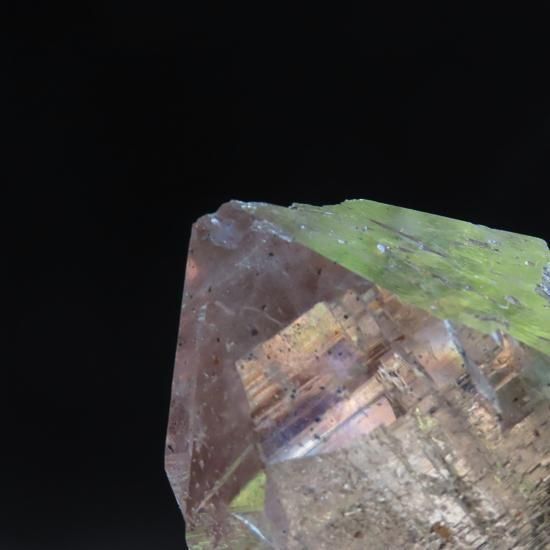 全体的に透明度が非常に高く透き通ったクリスタルです。ライトスモーキーな色味とリモナイトが引き締まった印象をもたらします。また内部にクラックがあるため角度により虹を見ることも出来ます。正面から見た時の透明度は極上です。さらに裏面には非常に細かく成長線と接合線が見られます。ガネーシュヒマールらしいシェイプを持った素晴らしいクリスタルです。