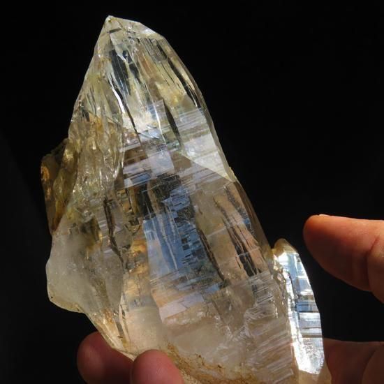 根本まで形のしっかりとした透明度の高いテッシンハビット型のガネーシュヒマール産水晶です。ライトスモーキーな色味で輝きにメタリックな印象を受けます。水晶の表面には細かく成長線(横ライン)と接合線(縦ライン)が刻まれていて見どころ満載です。エッジ、トップ共に状態の良いとても綺麗な水晶です。