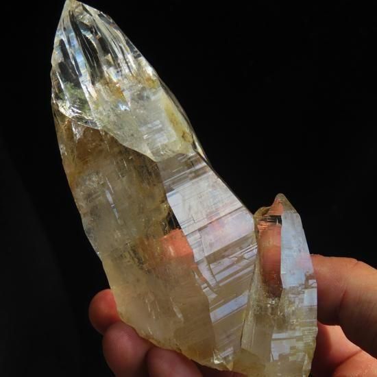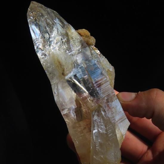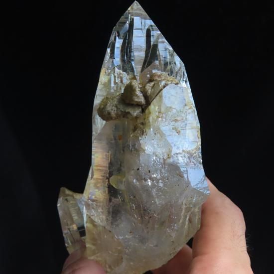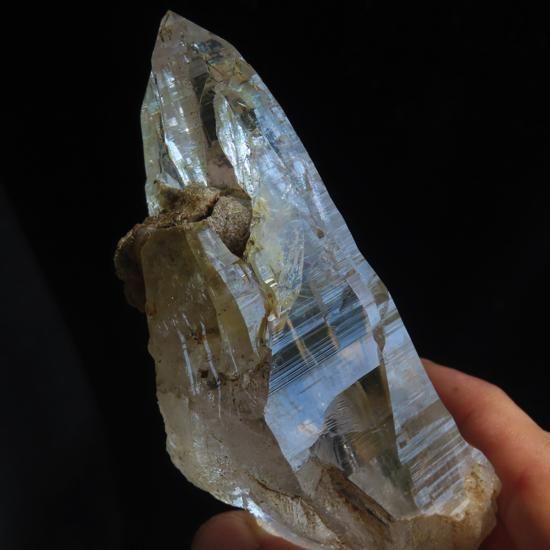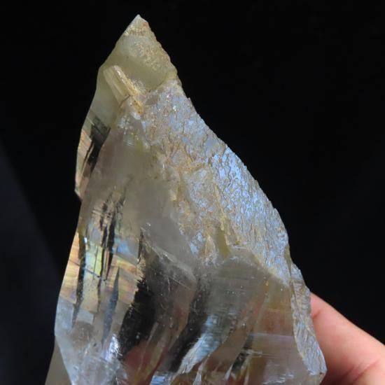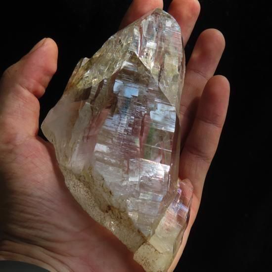 頭からつま先まで抜群な透明度を持った水晶原石です。先細りシェイプでバッチリセルフヒールドになっています。裏面には劈開性があるように見えるのでおそらくマイカが付着しています(画像6枚目参照)。手のひらに収まるサイズですが、ずっと見ていられるような結晶です。
