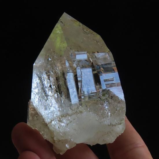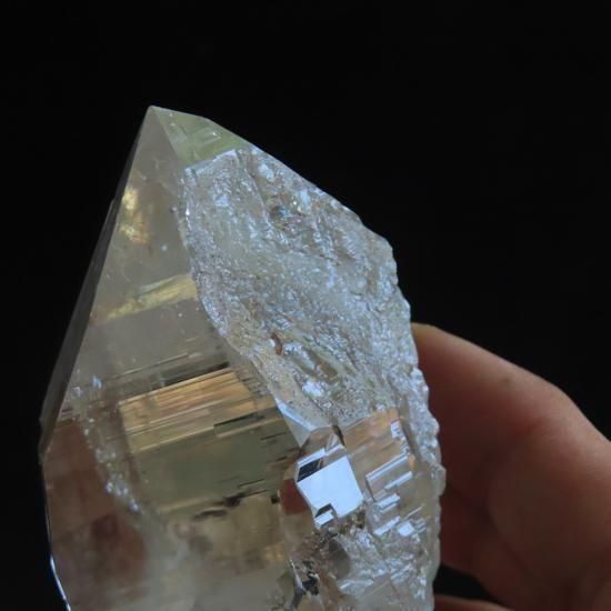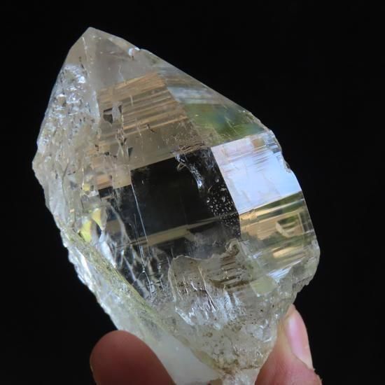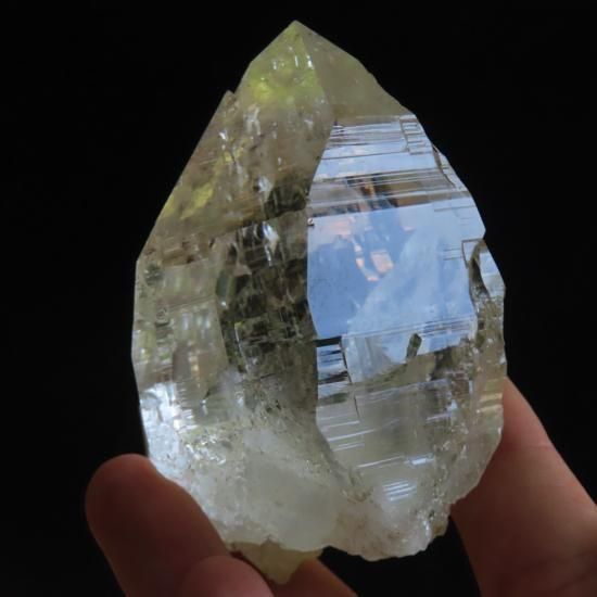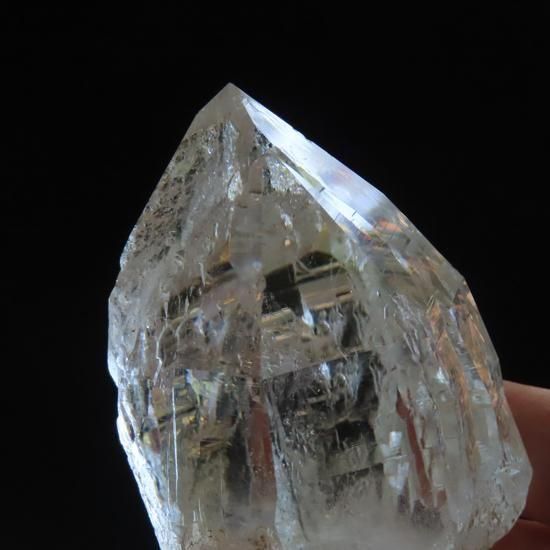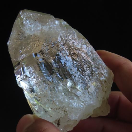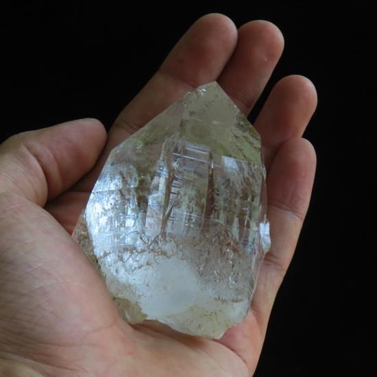 頭からつま先まで抜群な透明度を持った水晶原石です。先細りシェイプでバッチリセルフヒールドになっています。裏面には劈開性があるように見えるのでおそらくマイカが付着しています(画像6枚目参照)。手のひらに収まるサイズですが、ずっと見ていられるような結晶です。