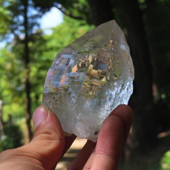 成長線、接合線も美しく、フォルムも整っています。 全ての面が光の角度によって虹色に光るゴールデンヒーラータイプになっています。 また、小さな水晶が3つポイント貫入、内包されており、クォーツインクォーツになっています。(写真5,6枚目参照)状態も良くずっと手に取って見ていたくなるような水晶です。