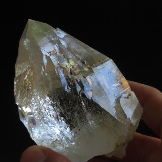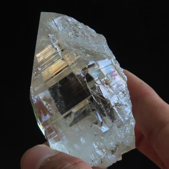 表面の光沢が鮮烈なガネーシュヒマール産水晶です。結晶内部も透明感が際立ちます。6面中2面は艶消しのようになっていますが、味があり美しいです。また、内部にクラックが入っており角度によってレインボーも楽しめます。手に取るとずっしり見た目以上の重量感があります。状態も良く、エッジが効いていて美しい単結晶の水晶原石です。