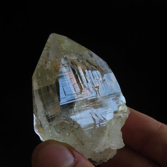 透明度が非常に高いテッシンハビットタイプのポイントです。 若干ライトスモーキーな色合いが透明感を際立たせます。 成長線と接合線も非常に美しくかつ力強さも感じさせます。 全面光沢の素晴らしいクリスタルです。