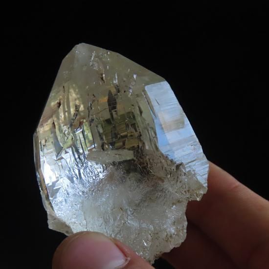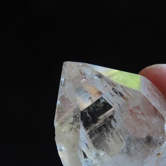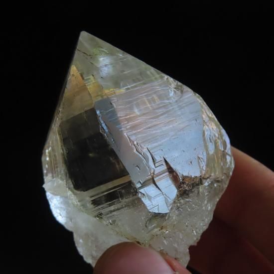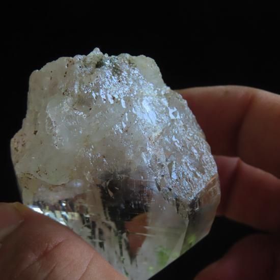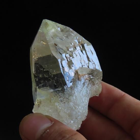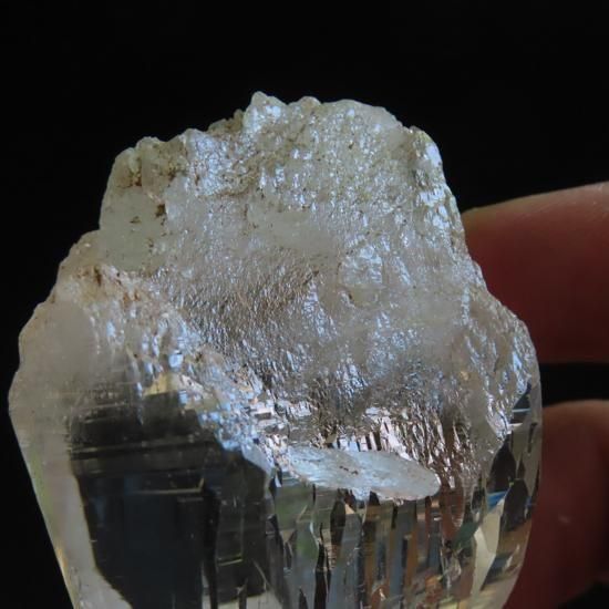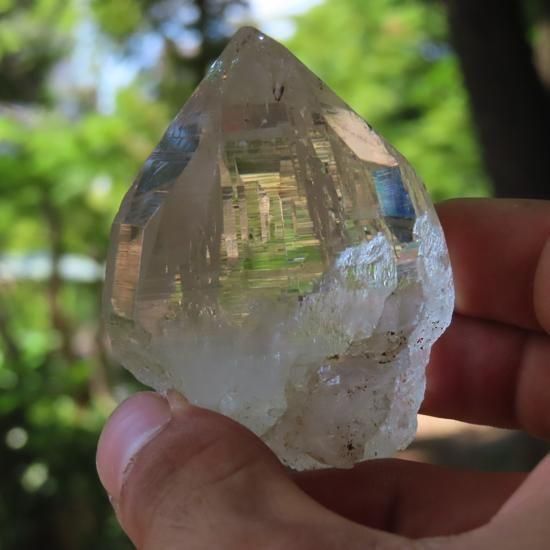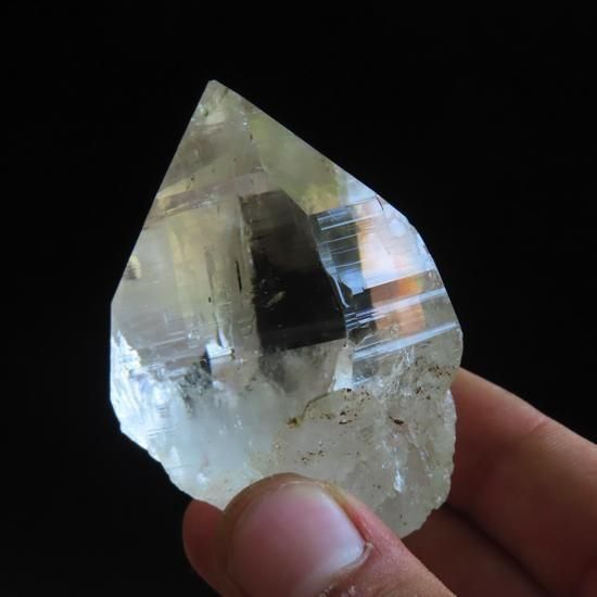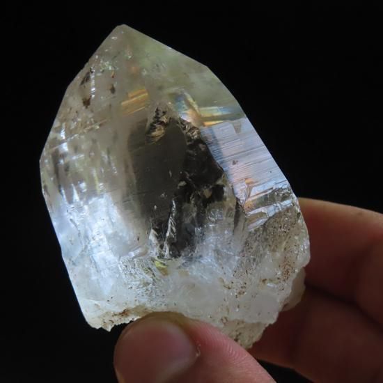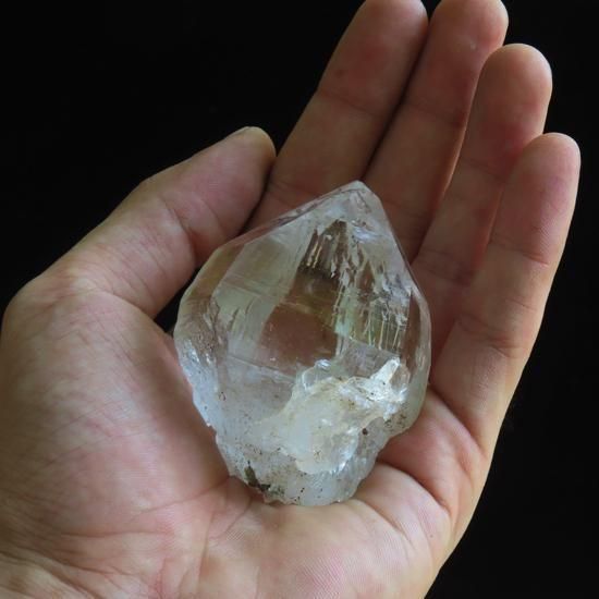 頭からつま先まで抜群な透明度を持った水晶原石です。先細りシェイプでバッチリセルフヒールドになっています。裏面には劈開性があるように見えるのでおそらくマイカが付着しています(画像6枚目参照)。手のひらに収まるサイズですが、ずっと見ていられるような結晶です。