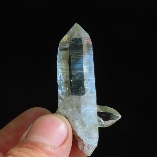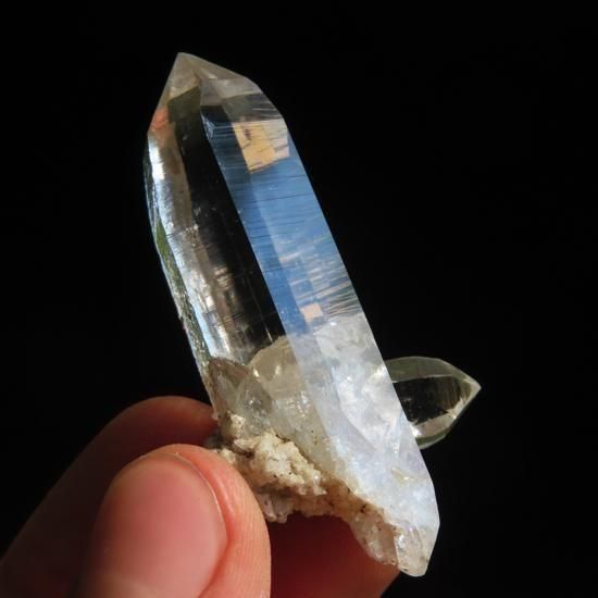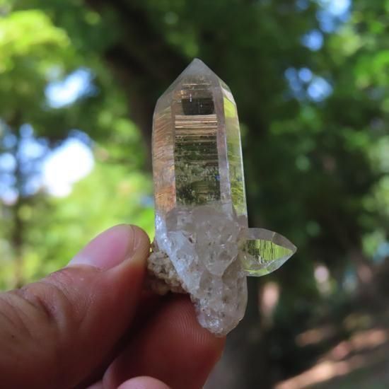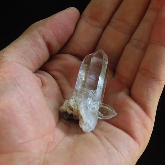 頭からつま先まで抜群な透明度を持った水晶原石です。先細りシェイプでバッチリセルフヒールドになっています。裏面には劈開性があるように見えるのでおそらくマイカが付着しています(画像6枚目参照)。手のひらに収まるサイズですが、ずっと見ていられるような結晶です。