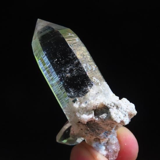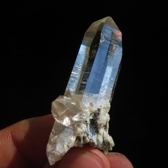 透明度が非常に高いテッシンハビットタイプのポイントです。 若干ライトスモーキーな色合いが透明感を際立たせます。 成長線と接合線も非常に美しくかつ力強さも感じさせます。 全面光沢の素晴らしいクリスタルです。