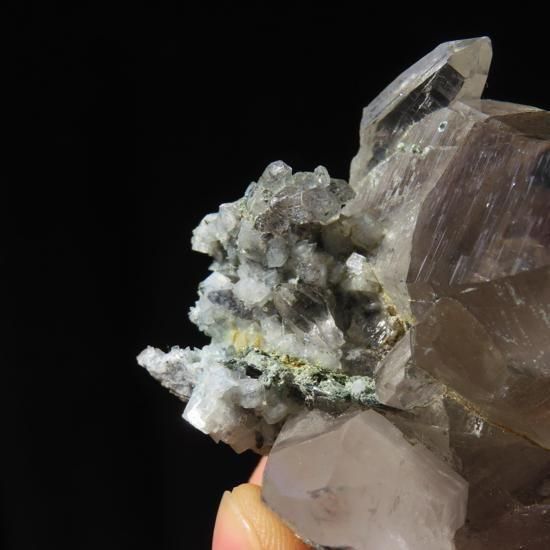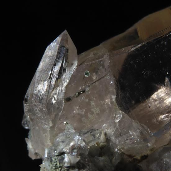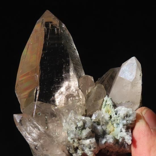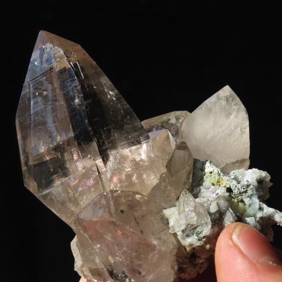 クローライト(緑泥石)とアンフィボール(角閃石)、アクチノライト(緑閃石)が内包されたガネーシュヒマール産水晶です。付着面にはアルバイト(氷長石)が付着しています。ガネーシュヒマールの力強さを感じられるような結晶です。