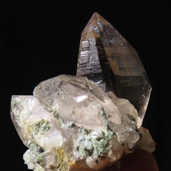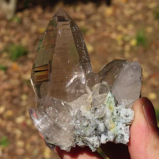 クローライト(緑泥石)とアンフィボール(角閃石)、アクチノライト(緑閃石)が内包されたガネーシュヒマール産水晶です。付着面にはアルバイト(氷長石)が付着しています。成長線がはっきりしていて手で回しながら見ているととても綺麗です。