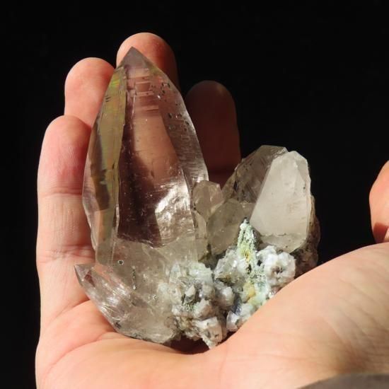 水晶の表面は一部マットな部分もございますが、光沢のある部分は強い光沢を持ち、結晶の透明度は曇りがなく高いです(写真1枚目一番右の結晶を除く)。