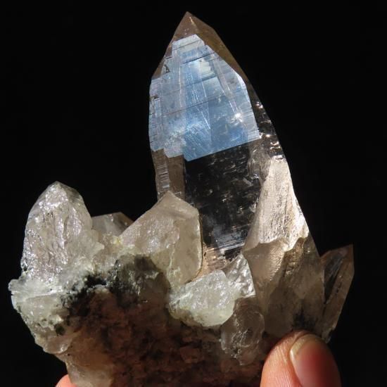 ライトスモーキーカラーのガネーシュヒマール産水晶です。ヘマタイトが付着、貫入しているのが散見できます。また一部ヘマタイトの表面が青く変色していてとても美しいです。