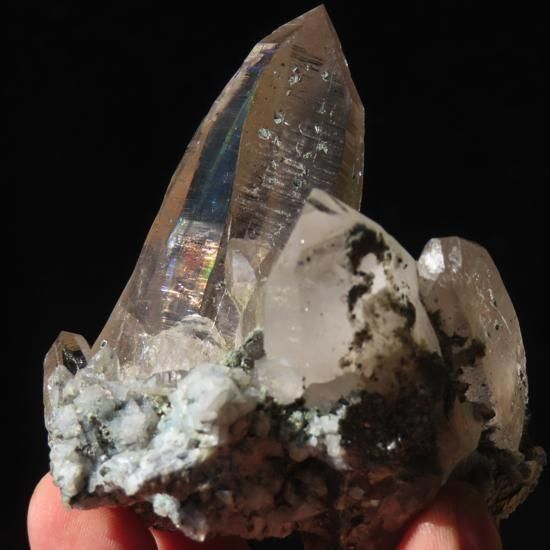 成長線、接合線も美しく、フォルムも整っています。 全ての面が光の角度によって虹色に光るゴールデンヒーラータイプになっています。 また、小さな水晶が3つポイント貫入、内包されており、クォーツインクォーツになっています。(写真5,6枚目参照)状態も良くずっと手に取って見ていたくなるような水晶です。