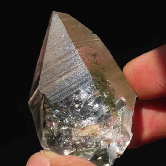 水晶表面の成長線が深めに刻まれており光の角度によってそこにプリズムが見られ美しいです。