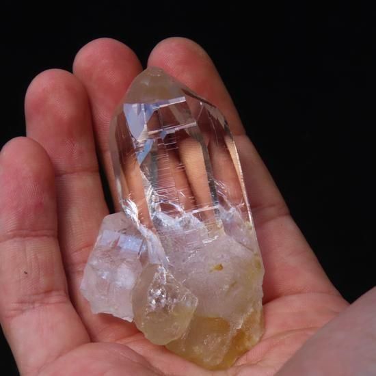 頭からつま先まで抜群な透明度を持った水晶原石です。先細りシェイプでバッチリセルフヒールドになっています。裏面には劈開性があるように見えるのでおそらくマイカが付着しています(画像6枚目参照)。手のひらに収まるサイズですが、ずっと見ていられるような結晶です。