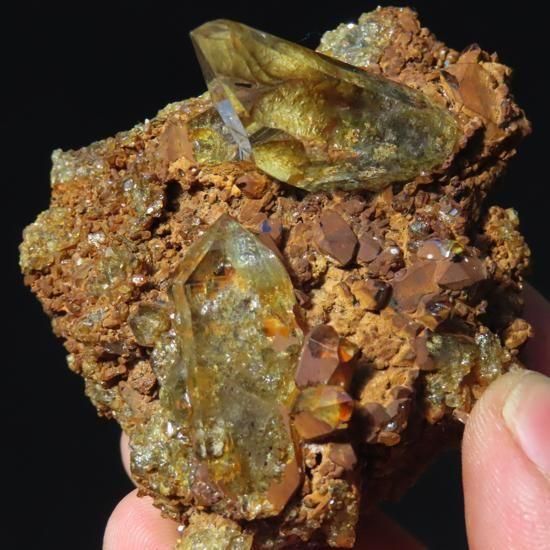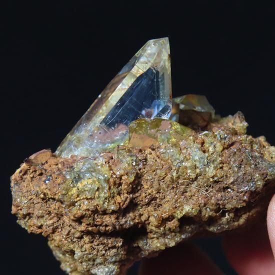 母岩付きのガネーシュヒマール産水晶原石クラスタータイプです。水晶の表面や結晶同士の隙間などにリモナイト(褐鉄鉱)が付着、侵入しています。また、リモナイトに覆われていますが母岩部分も細かな水晶たちで構成されています。メインとなる2本のポイントは傷など見受けられず、どちらも非常に良い状態です。透明度表面光沢ともに高いおすすめできる水晶です。