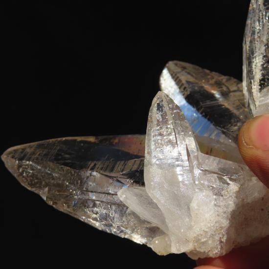 頭からつま先まで抜群な透明度を持った水晶原石です。先細りシェイプでバッチリセルフヒールドになっています。裏面には劈開性があるように見えるのでおそらくマイカが付着しています(画像6枚目参照)。手のひらに収まるサイズですが、ずっと見ていられるような結晶です。