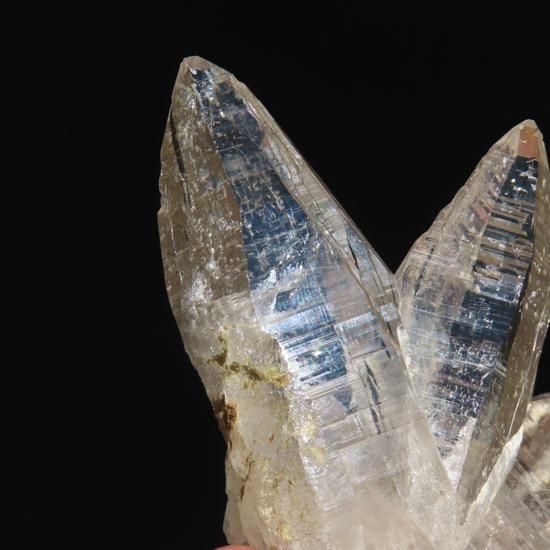 大きめのポイント3本と小さなポイントが1本で構成されたガネーシュヒマール産水晶クラスターです(写真2枚目参照)。結晶はテッシンハビットのような形をしていて、先細りになっています。無色透明な色味で透明度、光沢どちらも高い結晶です。一点のみ、一番右のポイントのトップに欠けがございます(写真5枚目参照)。また、写真7枚目の部分では、水晶表面が波打つような形をしておりこちらもみどころです。結晶の一部に雲母が付着しています(写真10枚目参照)。